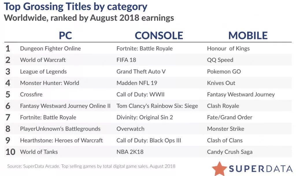 PC类前三名分别为《DNF》,《魔兽世界》与《英雄联盟》,而《怪物猎人:世界》则首度进榜,一口气挤入第四名。SuperData表示,《怪物猎人:世界》在家用主机平台推出后获得成功,而在PC平台销售更超过200万套。