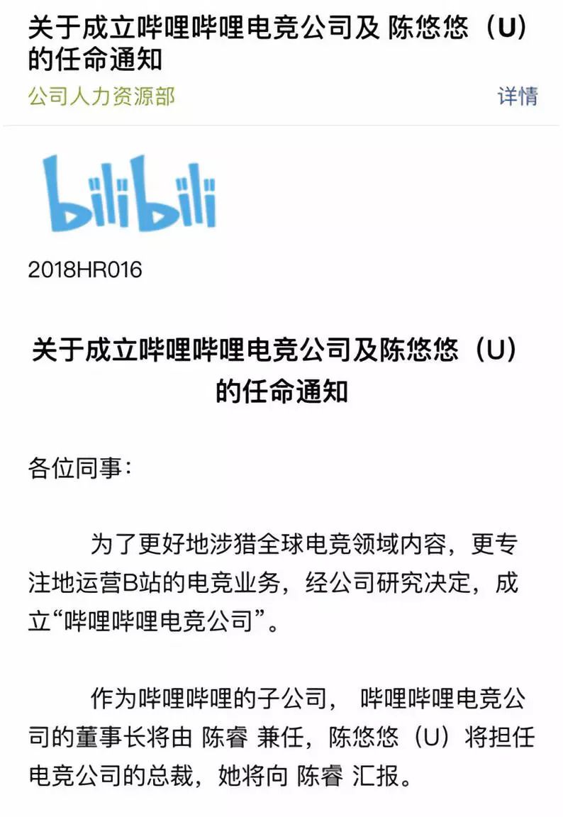 10月10日,B站发布公告宣布将会成立“哔哩哔哩电竞公司”,而该公司总裁将会由前战旗直播CEO陈悠悠担任。